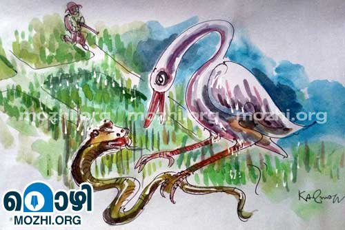 മുളയിനിക്കുന്നേൽ പാടവരമ്പിലേക്ക് താഴ്ന്നിറങ്ങി എന്നെ വരമ്പിൽ വെച്ച് ഒറ്റക്കാലുകൊണ്ട് ചവിട്ടിപ്പിടിച്ചു കൊത്താൻ തലതാഴ്ത്തുമ്പോൾ ആരുടെയോ എയർഗണ്ണിൽനിന്ന് ഒരു വെടി മുഴങ്ങി. തീറ്റി മറന്ന് കൊക്ക് പറന്നു.